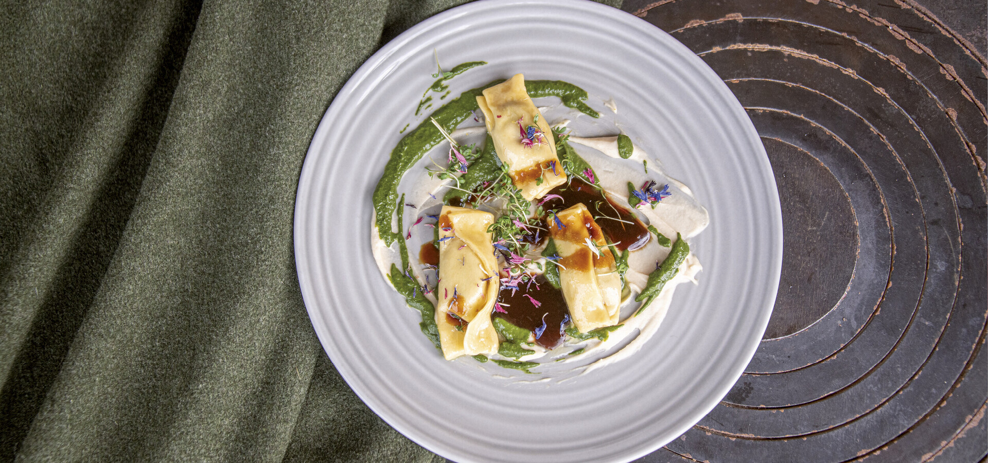 Drei verschiedene Fotos. Einmal sind fünf Personen in traditioneller Tracht vor einer Hütte. Ein Essensfoto mit Ravioli auf grüner Sauce und eine Detailaufnahme eines alten Schrankes mit Gläsern und mehreren Vintage-Schüssel oben drauf.